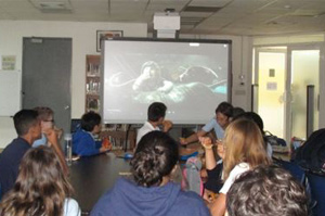 Every month, we have a lunch in which mentors and learners engage in activities to increase their speaking and listening skills. These students are in different classes. They eat together and then participate in communication games using visuals, competitions, karaoke, and a little dancing. It is a voluntary activity, but we encourage students to participate. This month we complemented our strategies with a movie in Spanish. In a later date, students will have various activities in the classroom depending on their level.
